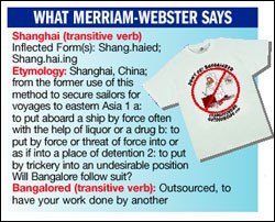 WASHINGTON : 中国の都市名「上海」(Shanghai)は、動詞では「酔わせて船に連れこむ、だまして・・・させる(三省堂「デイリーコンサイス英和辞典」第7版参)」という意味になる。 同じように、インドを代表するソフトウェア都市名あり、名高いアウトソーシング産業の地「バンガロール(Bangalore)」が、「コストを安く上げるため、仕事を外部(海外)に委託する」意味の動詞として、広く使われ始めているらしい。