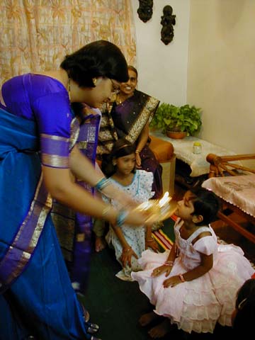 家に5歳以下の子供がいれば、ルート(Loot)という楽しい儀式もします。 ホストの子供を中央に座らせ、ハルディ・クムクムをしたら、頭のてっぺんからキャンディやチョコレート、ビスケット、角砂糖などをふりかけ、まわりに座った子供たちはそれを競って拾います。