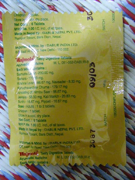 手元にあるのは130粒入り19ルピーのビン入りだが、小売りもされていて6粒ずつほどパックになって1−2ルピーほど。