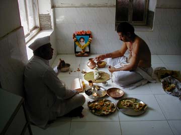 おじいさんの息子と僧侶は、お供えの食事を火で燃やし、おじいさんに最後の食事を与え、今日を境にこの世との縁を断ち切って自由に新しい人生を始めてくれるようにお祈りする。
