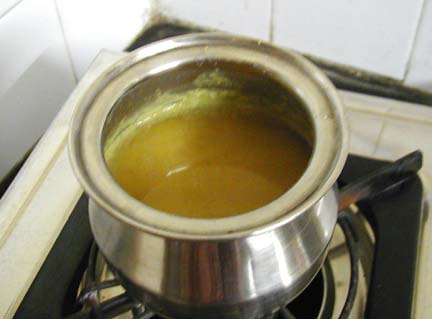 火を止めて、鍋が熱いうちに必要量のギィーを小さな容器に入れて、ふたの上に置いて