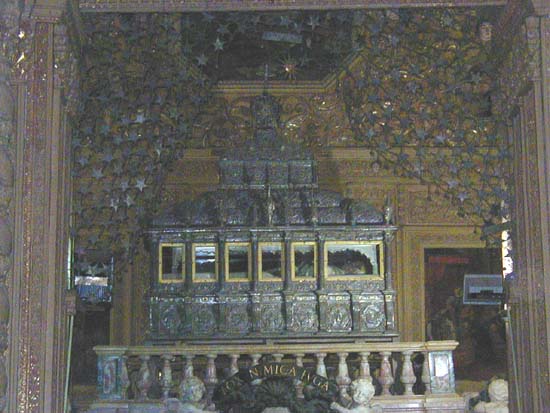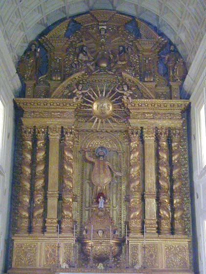 フランシスコ・ザビエルの遺体は12年に一度のみ公開されると聞いていたが、実際には聖堂内正面向かって右脇の、薄暗い祭壇の高いところに備えられたガラスの棺に、首をややすくめたような感じで窮屈そうに収まる彼を拝むことができる。