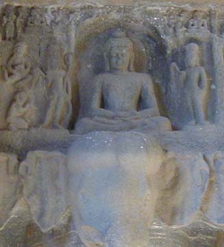 石窟脇に例のごとく色鮮やかなヒンドゥー寺院があり(これは絶対紀元前に建てられたものではない)、たくさんの人々が参拝しているのはよいのだが、石窟の中から昔のロナヴァラの大自然がどのように見えたのだろう、と古代にちょっと思いを馳せたいわたしたちの想像力を、見事に妨げるのが残念なところ。 |